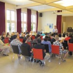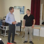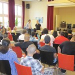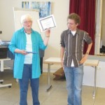 Dann präsentierte Herr Bradenstahl das Gesamtergebnis der Abschlussprüfung und bezeichnete es als „ganz ordentlich“. In der 08H2 hätten 80% und in der 08H3 83% die Abschlussprüfung bestanden. Prüfungsbeste waren in der 08H2 Hasan Pamukoglu mit einem Zensurenschnitt von 1,9 und in der 08H3 Tobias Kirsten mit einem Schnitt von 2,2.